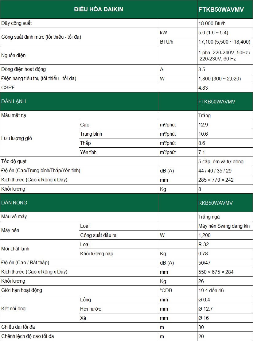 Với công suất 18000BTU, chiếc điều hòa Daikin Inverter 1 chiều FTKB50WAVMV này sẽ là lựa chọn rất lý tưởng cho những căn phòng có diện tích từ 20 - 30m2.