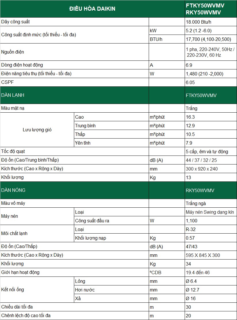 Với công suất 18000BTU, chiếc điều hòa Daikin Inverter 1 chiều FTKY50WVMV này sẽ là lựa chọn rất lý tưởng cho những căn phòng có diện tích từ 20 - 30m2.